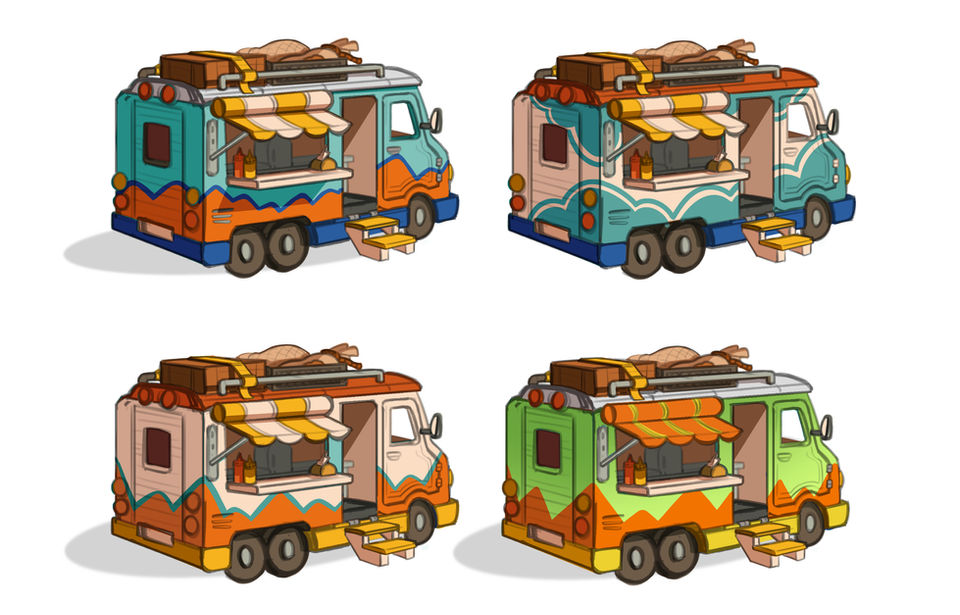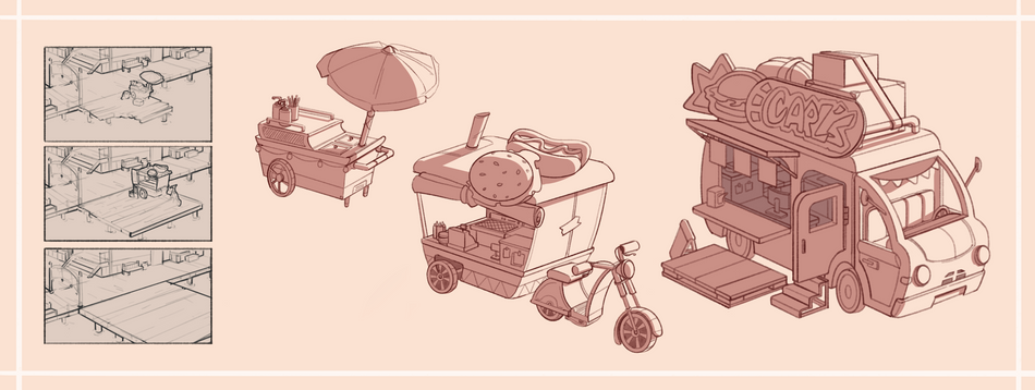 A low-poly, 3d street food restaurant concept design for a game that takes place on a small town pier, for my personal project. The concept art shows how the run-down pier would look before creating the restaurant. I have made various 2D game asset concepts of the items geometrical so they could also be modelled in 3d.